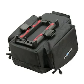 UniKlip allows you to use bags and boxes on various different racks. The pre-tensioned latches automatically adjust to the rack’s diameter and securely fix your gear on rack tubes with a Ø of 8 – 16 mm. The spring clamp can usually stay on the rack. The UniKlip adapts to rack widths of 9 – 16 cm – and even fits rack tubes that do not run parallel. Just loosen the four bolts and adjust the rails using the scale. The bag is fixed to the rack by folding down both latches. Once they have clicked into place, you can activate the theft protection. The UniKlip comes with a locking function for the lever. Insert the key into the red recess, tilt it upwards and move it towards the lever to lock. Compatible with V-shaped racks. Also compatible with built-in batteries.