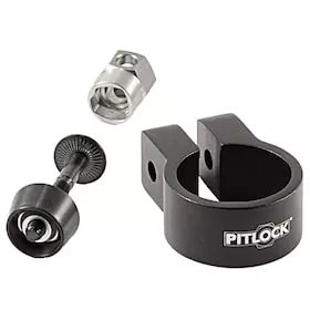 Just parked your bike for a short while and your saddle was gone. – Without the efficient Pitlock Set 14 locking device at your saddle clamp, it will be easy for occasional thieves to snatch your saddle including your seatpost. Quick-releases are particularly inviting, yet screw-on tension axles can also be opened quickly with the right tools. To secure your seatpost, you can use the Pitlock saddle clamp with special axle and coded closure. The specially milled, coded nut of the solid axle can only be loosened with the matching Pit key. There are over 1000 different key combinations available. Besides, the handy Pit adapter is small enough for your key ring, so that you can remove the wheels whenever you want. A separately available, matching Pit tool can be found with prod. code 2288613.